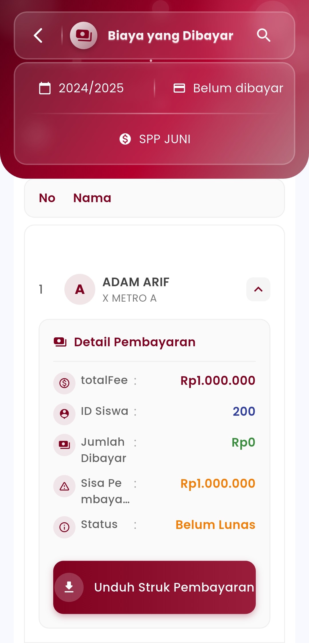 Track all student payment transactions in a structured and efficient manner in one view. This feature makes it easy for you to know the payment status of each student—whether fully paid or still having arrears.